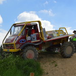 První sekci zajeli kluci velice dobře a byli v průběžném bodování druzí. V tu chvíli by ani jednoho z nich nenapadlo, jak rychlý a nezvratný bude další průběh závodu. Nepovedený manévr hned v druhé brance druhé sekce, skončil boudou na bok Unimogu a nadělil naší posádce závratný počet trestných bodů.